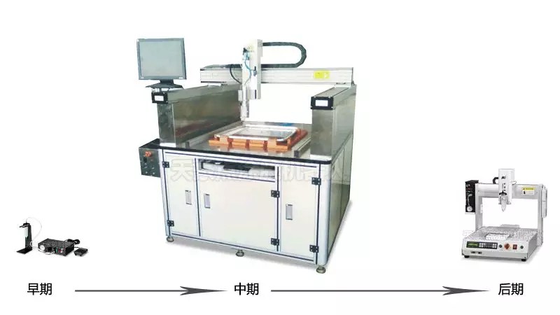 最早期的點膠機,只是一個控制流體出膠量的控制系統(tǒng)。后來發(fā)現(xiàn)人工手持這種設(shè)備,雖然出膠量可以控制了,但出膠沒有一致性,而且還不美觀。人工要達到這一效果,要經(jīng)歷很長一段時間的磨練,這對生產(chǎn)無疑是不利的一面。經(jīng)過研發(fā)人員不斷的摸索與研究,開發(fā)出控膠系統(tǒng)與自動化設(shè)備相結(jié)合的新型設(shè)備。在早期這種設(shè)備的外形還很龐大,得不到有效的推廣,原因有很多,第一,他的造價很高;第二,外形太大,不好移動;第三,開發(fā)機器的周期較長。為了再次適應(yīng)市場需求,又繼續(xù)研發(fā),千錘百煉之后,就得到了我們目前市場上的標準點膠機了,機形小巧,功能靈活搭載,造價相比之前降低了很多。